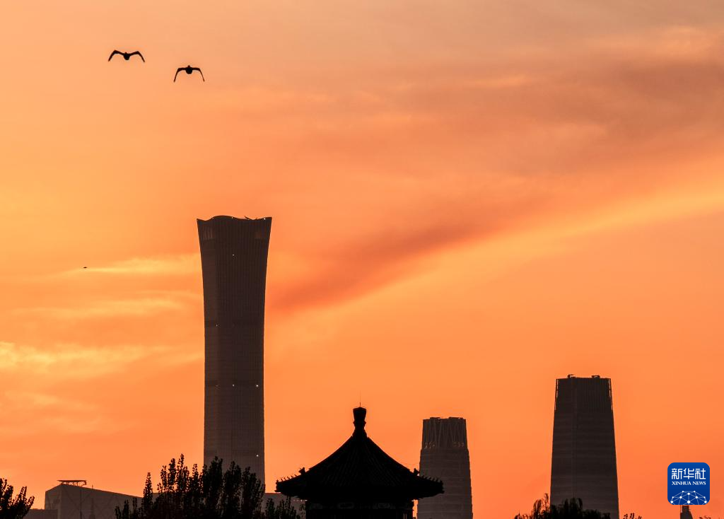 11月10日拍摄的北京清晨,阳光明媚。11月10日清晨,北京的晨光稍稍褪去,天空布满了耀眼的光芒。中国尊、望海楼等地标建筑在晨光中渗透着什刹海的光影。新华社记者 常能佳 摄